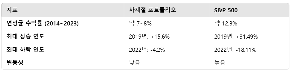 S&P 500은 장기적으로 더 높은 수익률을 제공하지만, 변동성이 크고 하락기에 상당한 손실을 기록할 위험이 있습니다. 반면, 사계절 포트폴리오는 안정성을 중시하며, 손실을 최소화하고 꾸준한 성과를 추구합니다.