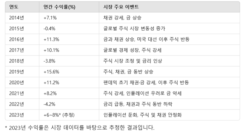 2014년부터 2023년까지의 연간 수익률 추정치입니다 (출처 : chatGPT)