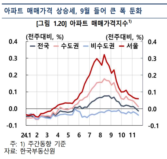 2024년 말과 2025년 초에는 주택가격 상승세가 당분간 둔화될 것으로 보입니다. 이는 은행의 대출 규제 강화, 매물 증가세, 그리고 계절적 비수기인 연말과 연초의 특성 때문입니다.