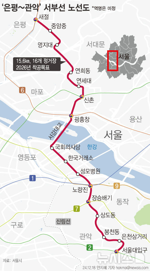 서부선은 서울 서북권과 서남권의 교통난을 해소하기 위해 계획된 도시철도로, 은평구 새절역(6호선)에서 관악구 서울대입구역(2호선)까지 약 15.6km를 연결합니다. 1·2·6·7·9호선과 환승이 가능하며, 16개의 정거장이 포함되어 있어 서울 서북권과 서남권을 포괄하는 대중교통의 핵심 축이 될 것입니다.