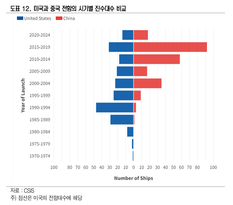 일반 조선업에서 미국이 경쟁력을 잃었지만, 세계 1위 국방력을 자랑하는 만큼 방산조선업은 여전히 중요한 분야로 남아 있습니다. 하지만 중국의 빠른 성장세는 미국에게 위협이 되고 있습니다. 중국 군함의 다수가 2010년 이후에 진수된 반면, 미국 군함의 약 75%는 2010년 이전에 진수되어 노후화 문제가 심각합니다. 이로 인해 미국은 군함 현대화와 방산조선업의 강화를 절실히 요구받고 있습니다.