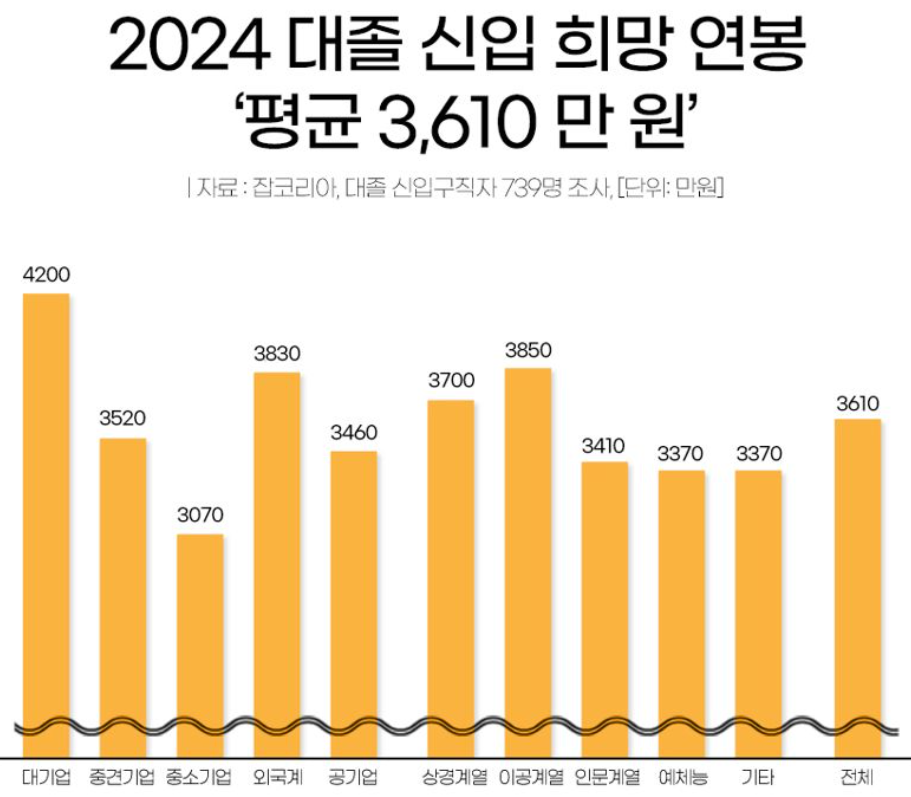 • 중소기업: 중소기업을 목표로 하는 구직자의 희망 연봉은 평균 3,070만 원으로 가장 낮았습니다. 이는 중소기업의 평균 초임 수준과 기업의 재정적 한계가 반영된 결과로 보입니다.