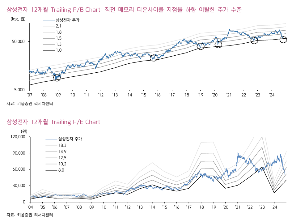 2024년 키움증권 예상치로 삼성전자의 PBR은 0.9배로 역사적 최저수준입니다. PER은 10.0배로 과거 PER 8배 밴드까지 하락한 사례는 있어, 삼성전자 주가의 추가 하락의 위험성을 배제할 수는 없습니다.